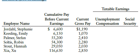Taxable Earnings Cumulative Pay Before Current Current Unemployment Social Employee Name Jordahl, Stephanie Keesling, Emily Palmer, Stefan Soltis, Robin Stout, Hannah Xia, Xu Earnings $ 6,600 6,150 55,200 54,300 29,050 116,630 Gross Pay Compensation Security $1,190 1,070 2,410 2,280 2,030 2,850
