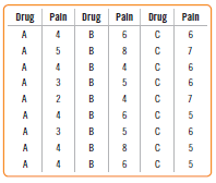 A pharmaceutical company tested three formulations of a pain relief medicine for migraine headache sufferers. For the experiment, 27 volunteers were selected and 9 were randomly assigned to one of three drug formulations. The subjects were instructed to take the drug during their next migraine headache episode and to report their pain on a scale of 1 = no pain to 10 = extreme pain, 30 minutes after taking the drug.
