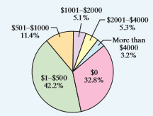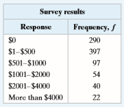 Survey results Response Frequency, f 290 $1-$500 397 $501-$1000 97 $1001-$2000 54 $2001-$4000 40 More than $4000 22 $1001-$2000 5.1% $2001-$4000 5.3% $501-$1000 11.4% More than $4000 3.2% $1-$500 42.2% $0 32.8%