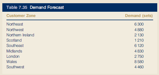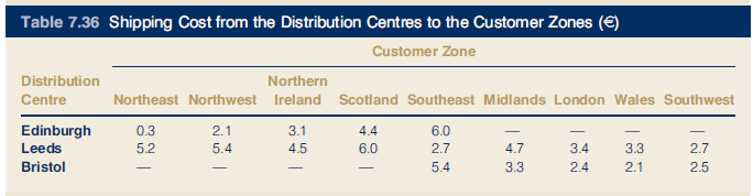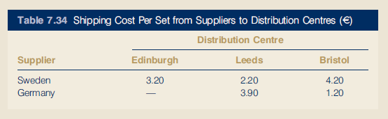 Table 7.34 Shipping Cost Per Set from Suppliers to Distribution Centres (€) Distribution Centre Supplier Edinburgh Leeds Bristol Sweden 3.20 2.20 4.20 Germany 3.90 1.20 Table 7.35 Demand Forecast Customer Zone Demand (sets) Northeast 6 300 Northwest 4 880 Northern Ireland 2 130 Scotland 1210 Southeast 6 120 Midlands 4 830 London 2 750 Wales 8 580 Southwest 4 460 Table 7.36 Shipping Cost from the Distribution Centres to the Customer Zones (€) Customer Zone Distribution Northern Centre Northeast Northwest Ireland Scotland Southeast Midlands London Wales Southwest Edinburgh 0.3 2.1 3.1 4.4 6.0 Leeds 5.2 5.4 4.5 6.0 2.7 4.7 3.4 3.3 2.7 Bristol 5.4 3.3 2.4 2.1 2.5