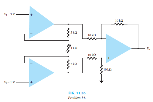 > Calculate the output voltage for the circuit of Fig. 11.50 with inputs of V1 = 40 mV rms and V2 = 20 mV rms.