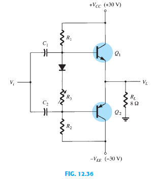 > For the class B power amplifier of Fig. 12.36, calculate: a. Maximum Po(ac). b. Maximum Pi(dc). c. Maximum %h. d. Maximum power dissipated by both transistors.