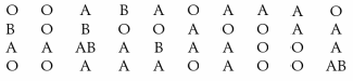 Recorded here are the blood types of 40 persons who have volunteered to donate blood at a plasma center. Summarize the data in a frequency table. Include calculations of the relative frequencies.