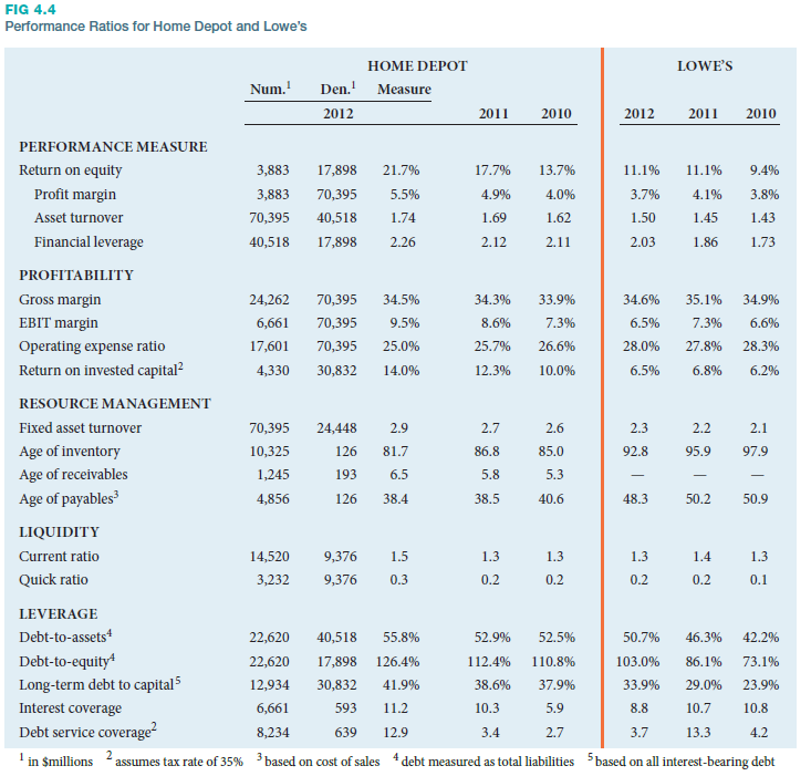 FIG 4.4 Performance Ratios for Home Depot and Lowe's НОME DEPOT LOWE'S Num.! Den.' Measure 2012 2011 2010 2012 2011 2010 PERFORMANCE MEASURE Return on equity 3,883 17,898 21.7% 17.7% 13.7% 11.1% 11.1% 9.4% Profit margin 3,883 70,395 5.5% 4.9% 4.0% 3.7% 4.1% 3.8% Asset-turnover' data-toggle="tooltip" data-placement="top" title="Click to view definition...">Asset Turnover 70,395 40,518 1.74 1.69 1.62 1.50 1.45 1.43 Financial leverage 40,518 17,898 2.26 2.12 2.11 2.03 1.86 1.73 PROFITABILITY Gross margin 24,262 70,395 34.5% 34.3% 33.9% 34.6% 35.1% 34.9% EBIT margin 6,661 70,395 9.5% 8.6% 7.3% 6.5% 7.3% 6.6% Operating expense ratio 17,601 70,395 25.0% 25.7% 26.6% 28.0% 27.8% 28.3% Return on invested capital? 4,330 30,832 14.0% 12.3% 10.0% 6.5% 6.8% 6.2% RESOURCE MANAGEMENT Fixed asset turnover 70,395 24,448 2.9 2.7 2.6 2.3 2.2 2.1 Age of inventory 10,325 126 81.7 86.8 85.0 92.8 95.9 97.9 Age of receivables 1,245 193 6.5 5.8 5.3 Age of payables 4,856 126 38.4 38.5 40.6 48.3 50.2 50.9 LIQUIDITY Current ratio 14,520 9,376 1.5 1.3 1.3 1.3 1.4 1.3 Quick ratio 3,232 9,376 0.3 0.2 0.2 0.2 0.2 0.1 LEVERAGE Debt-to-assets* 22,620 40,518 55.8% 52.9% 52.5% 50.7% 46.3% 42.2% Debt-to-equity* Long-term debt to capital 5 22,620 17,898 126.4% 112.4% 110.8% 103.0% 86.1% 73.1% 12,934 30,832 41.9% 38.6% 37.9% 33.9% 29.0% 23.9% Interest coverage 6,661 593 11.2 10.3 5.9 8.8 10.7 10.8 Debt service coverage 8,234 3.4 639 12.9 2.7 3.7 13.3 4.2 1 in $millions assumes tax rate of 35% based on cost of sales *debt measured as total liabilities based on all interest-bearing debt |