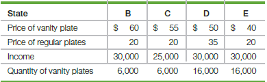 B c D E $ 60 $ 55 $ 50 $ 40 State Price of vanlty plate $ Price of regular plates 20 20 35 20 Income 30,000 25,000 | 30,000 30,000 Quantity of vanlty plates 6,000 6,000 16,000 16,000