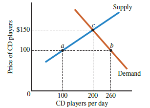 Supply $150 a 100 Demand 100 200 260 CD players per day Price of CD players Supply 15 a 10 7 Demand 2 4 7 1012 T-shirts per month Pri ce per T-shirt