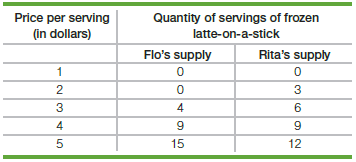 8. Market Supply of Frozen Latte-on-a-Stick. The following table shows Flo's and Rita's individual supply schedules for servings of frozen latte-on-a-stick.