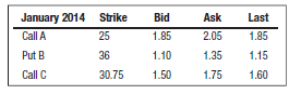 January 2014 Strike Bid Ask Last Call A 25 1.85 2.05 1.85 Put B 36 1.10 1.35 1.15 Call C 30.75 1.50 1.75 1.60