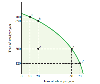 1.1. Consider Figure 2.1. Between points c and d, the opportunity cost of __________ tons of wheat is __________ tons of steel.