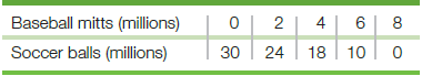 700 650 300 120 10 20 60 70 Tons of wheat per year Tons of steel per year Baseball mitts (millions) 2 4 6| 8 Soccer balls (millions) 30 24 18 | 10