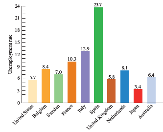 24 21 23.7 18 15 12.9 8.4 10.3 5.7 7.0 3 8.1 5.8 United States Belgium 64 France Italy 3.4 Sweden United Kingdom Netherlands Japan Spain Unemployment rate 12 Australia