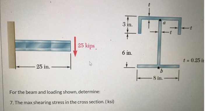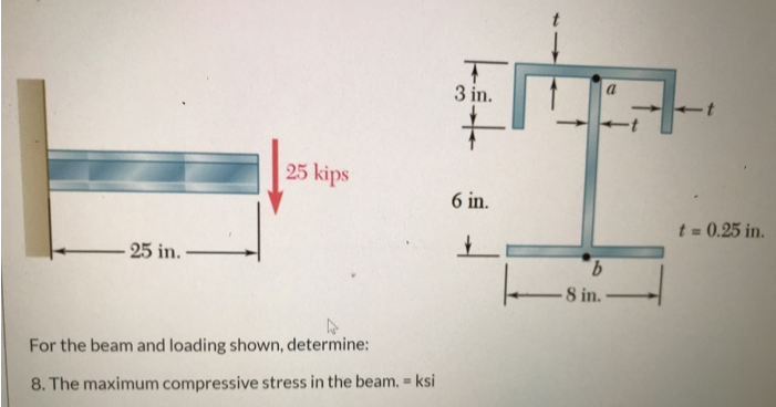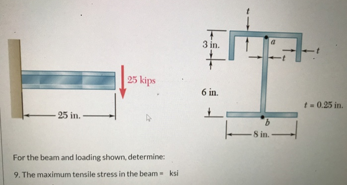 3 in. 25 kips. 6 in. t = 0.25 in -25 in.- 9. 8 in. For the beam and loading shown, determine: 6. The shearing stress at point b (ksi) 3 in. 25 kips, 6 in. t = 0.25 i 25 in. - 9. 8 in. For the beam and loading shown, determine: 7. The max shearing stress in the cross section. (ksi) 3 in. 25 kips 6 in. t = 0.25 in. 25 in. 9. 8 in. For the beam and loading shown, determine: 8. The maximum compressive stress in the beam. ksi %3D 3 in. 25 kips 6 in. t = 0.25 in. %3D 25 in.- 9. 8 in. For the beam and loading shown, determine: 9. The maximum tensile stress in the beam = ksi