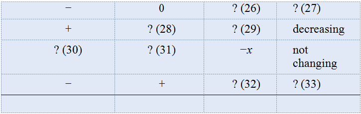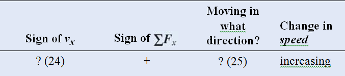 31 to 33. Each row of the table describes an object moving along the x-axis. Based on the information given in two of the columns, choose the correct entry for the other columns. The question number is in parentheses.