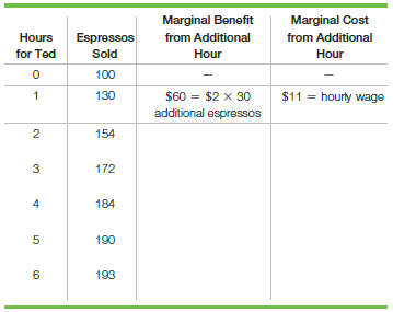 Marginal Benefit Marginal Cost Hours Espressos from Additional from Additional for Ted Sold Hour Hour 100 $60 = $2 x 30 additional esprossos 1 130 $11 = hourly wage 2 154 3 172 4 184 5 190 6 193