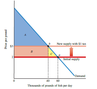 A New supply with $1 tax $3 B Initial supply Demand 40 60 Thousands of pounds of fish per day 2. punod 1od m