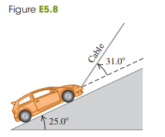 A 1130-kg car is held in place by a light cable on a very smooth (frictionless) ramp (Fig. E5.8). The cable makes an angle of 31.0° above the surface of the ramp, and the ramp itself rises at 25.0° above the horizontal.