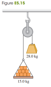 A 15.0-kg load of bricks hangs from one end of a rope that passes over a small, frictionless pulley. A 28.0-kg counterweight is suspended from the other end of the rope (Fig. E5.15). The system is released from rest.
