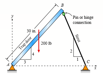 A 200-lb trap door (AB) is supported by a strut (BC) which is pin connected to the door at B (see figure).