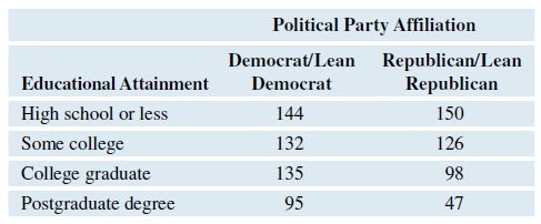 A 2018 Pew Research poll recorded respondents political affiliation and education attainment. A summary of the data is shown in the following table. Test the hypothesis that political party affiliation and educational attainment are associated at the 0.05 level.