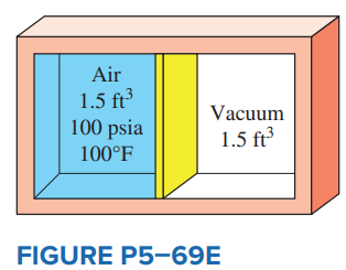 A 3-ft3 adiabatic rigid container is divided into two equal volumes by a thin membrane, as shown in Fig. P5â69E. Initially, one of these chambers is filled with air at 100 psia and 100°F while the other chamber is evacuated. Determine the internal energy change of the air when the membrane is ruptured. Also determine the final air pressure in the container.