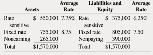Average Liabilities and Average Assets Rate Equity $ 375,000 6.25% Rate Rate $ 550,000 7.75% Rate sensitive sensitive Fixed rate Nonearning 755,000 8.75 Fixed rate 265,000 805,000 7.50 390,000 Nonpaying Total $1,570,000 Total $1,570,000
