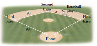 A baseball diamond is a 90-foot by 90-foot square. (See Fig. 9.) A player runs from first to second base at the speed of 22 feet per second. How fast is the playerâs distance from third base changing when he is halfway between first and second base?