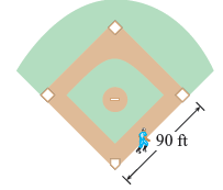 A baseball diamond is a square with side 90 ft. A batter hits the ball and runs toward first base with a speed of 24 ft/s.