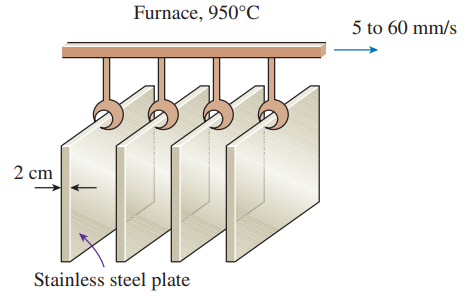 K) are conveyed through a furnace to be heat treated. The plates enter the furnace at 18°C, and they travel a distance of 3 m inside the furnace. The air temperature in the furnace is maintained at 950°C with a convection heat transfer coefficient of 150 W/m2â