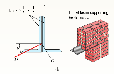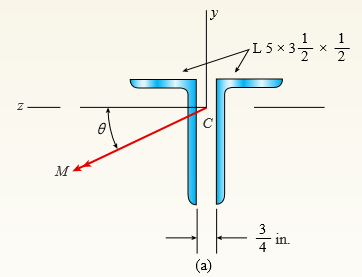 A beam made up of two unequal leg angles is subjected to a bending moment M having its vector at an angle θ to the z axis (see figure part a).
