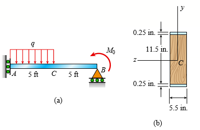 A beam with a guided support and 10-ft span supports a distributed load of intensity q = 660 lb/ft over its first half (see figure part a) and a moment Mo = 300 ft-lb at joint B. The beam consists of a wood member (nominal dimensions 6 in. Ã 12 in. and actual dimensions 5.5 in. Ã 11.5 in. in cross section, as shown in the figure part b) that is reinforced by 0.25-in. thick steel plates on top and bottom. The moduli of elasticity for the steel and wood are Es = 30 Ã 106 psi and Ew = 1.5 Ã 106 psi, respectively.