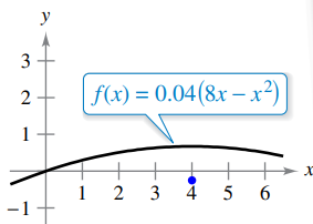 A bicyclist is riding on a path modeled by the function f(x) = 0.04(8x â x2), where x and f(x) are measured in miles (see figure). Find the rate of change of elevation at x = 2.