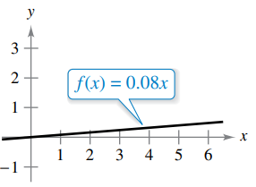 A bicyclist is riding on a path modeled by the function f(x) = 0.08x, where x and f(x) are measured in miles (see figure). Find the rate of change of elevation at x = 2.