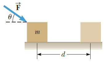 A block of mass m = 2.50 kg is pushed a distance d = 2.20 m along a frictionless horizontal table by a constant applied force of magnitude F = 16.0 N directed at an angle θ = 25.0° below the horizontal as shown in Figure P5.8. Determine the work done by