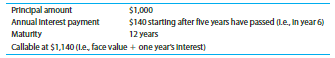 Principal amount Annual Interest payment Maturity Callable at $1,140 (Le, face value + one year's Interest) $1,000 $140 starting after five years have passed (1.e, In year 6) 12 years