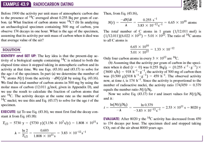 EXAMPLE 43.9 RADIOCARBON DATING Before 1900 the activity per unit mass of atmospheric carbon due Then, from Eq. (43.16), to the presence of 14C averaged about 0.255 Bq per gram of car- bon. (a) What fraction of carbon atoms were 14C? (b) In analyzing an archaeological specimen containing 500 mg of carbon, you observe 174 decays in one hour. What is the age of the specimen, The total number of C atoms in 1 gram (1/12.011 mol) is assuming that its activity per unit mass of carbon when it died was (1/12.011)(6.022 × 1023) = 5.01 × 102. The ratio of 14C atoms that average value of the air? –dN]dt 0.255 s1 6.65 x 1010 atoms N(t) 3.83 × 10-125¬1 to all C atoms is 6.65 x 1010 5.01 × 102 SOLUTION 1.33 x 10-12 IDENTIFY and SET UP: The key idea is that the present-day ac- tivity of a biological sample containing 14C is related to both the Only four carbon atoms in every 3 × 1012 are 1ªC. elapsed time since it stopped taking in atmospheric carbon and its activity at that time. We use Eqs. (43.16) and (43.17) to solve for men when it died (1 = 0) was 0.255 Ba/g = (0.255 s1.g)× the age t of the specimen. In part (a) we determine the number of (3600 s/h) = 918 h:g, the activity of 500 mg of carbon then "C atoms N(t) from the activity -dN(1)/dt by using Eq. (43.16). was (0.500 g)(918 h¯1g) = 459 hl. The observed activity We find the total number of carbon atoms in 500 mg by using the now, at time t, is 174 h1. Since the activity is proportional to the molar mass of carbon (12.011 g/mol, given in Appendix D), and number of radioactive nuclei, the activity ratio 174/459 = 0.379 we use the result to calculate the fraction of carbon atoms that equals the number ratio N(1)/Ng- are "C. The activity decays at the same rate as the number of 14C nuclei; we use this and Eq. (43.17) to solve for the age t of the specimen. (b) Assuming that the activity per gram of carbon in the speci- Now we solve Eq. (43.17) for 1 and insert values for N(t)/No and A: In 0.379 -3.83 x 10-125-1 In(N()/No) 2.53 × 101" s = 8020 y EXECUTE: (2) To use Eq. (43.16), we must first find the decay con- stant A from Eq. (43.18): EVALUATE: After 8020 y the 14C activity has decreased from 459 Tip = 5730 y = (5730 y)(3.156 × 10’s/y) = 1.808 × 10"'s to 174 decays per hour. The specimen died and stopped taking CO2 out of the air about 8000 years ago. In 2 A. 0.693 3.83 x 10-12s 1.808 X 10 s UTION