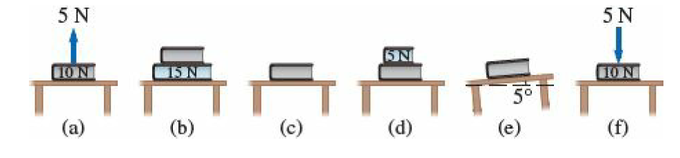 A book that weighs 10 N is at rest in six different situations. Blue arrows indicate forces exerted on the book by an object that is not shown. Rank the situations according to the magnitude of the normal force on the 10 N book due to the table, from smallest to greatest. Explain your reasoning.