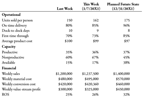Planned Future State (12/31/20X1) This Week Last Week (1/7/20X1) Operational Units sold per person On-time delivery Dock-to-dock days First-time through Average product cost Сараcity 150 162 175 80% 85% 96% 10 8 70% 73% 85% $100 $99 $97 Productive 35% 36% 37% Nonproductive 60% 67% 45% Available 15% 17% 38% Financial Weekly sales Weekly material cost Weekly conversion cost Weekly value-stream profit $1,200,000 $1,237,500 $1,400,000 $480,000 $495,000 $570,000 $420,000 $420,360 $460,000 $300,000 $325,000 $450,000 ROS 25% 26% 32%