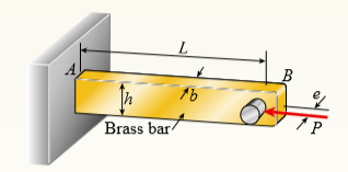 A brass bar of a length L = 0.4 m is loaded at end B by force P = 10 kN with an eccentricity e = 6 mm. The bar has a rectangular cross section with an h/b ratio of 1.5. Find the dimensions of the bar if the deflection at the end is limited to 4 mm. Assume that E = 110 GPa.