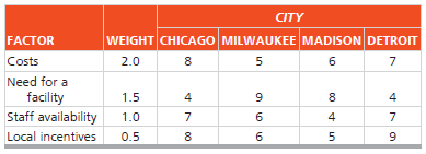 CITY FACTOR WEIGHT CHICAGO MILWAUKEE MADISON DETROIT Costs 2.0 8 5 6 7 Need for a facility Staff availability 1.5 4 8 4 1.0 7 6 4 7 Local incentives 0.5 8 6 5 9