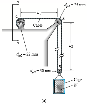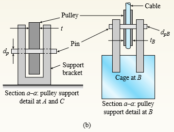 A cable and pulley system in the figure part a supports a cage of a mass 300 kg at B. Assume that this includes the mass of the cables as well. The thickness of each of the three steel pulleys is t = 40 mm. The pin diameters are dpA = 25 mm, dpB = 30 mm, and dpC = 22 mm (see figure part a and part b).