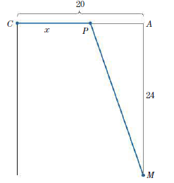 A cable is to be installed from one corner, C, of a rectangular factory to a machine, M, on the floor. The cable will run along one edge of the floor from C to a point, P, at a cost of $6 per meter, and then from P to M in a straight line buried under the floor at a cost of $10 per meter (see Fig. 15). Let x denote the distance from C to P. If M is 24 meters from the nearest point, A, on the edge of the floor on which P lies, and A is 20 meters from C, find the value of x that minimizes the cost of installing the cable and determine the minimum cost.