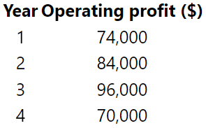 A capital investment requiring one initial cash outflow is forecast to have the operating profits listed below. The investment has an NPV of $20,850, based on a required rate of return of 12%. Calculate the payback period of the investment.