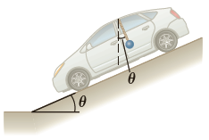 A car accelerates down a hill (Fig. P4.87), going from rest to 30.0 m/s in 6.00 s. During the acceleration, a toy (m = 0.100 kg) hangs by a string from the carâs ceiling. The acceleration is such that the string remains perpendicular to the ceiling. Determine