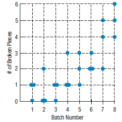 A ceramics factory can fire eight large batches of pottery a day. Sometimes a few of the pieces break in the process. In order to understand the problem better, the factory records the number of broken pieces in each batch for three days and then creates the scatterplot shown.