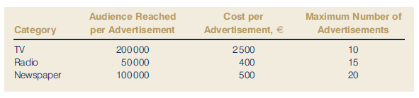 The last column in this table shows the maximum number of advertisements that can be run during the next two weeks; these values should be treated as constraints. The committee established the following goals for the campaign.