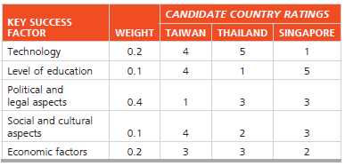 CANDIDATE COUNTRY RATINGS KEY SUCCESS FACTOR WEIGHT TAIWAN THAILAND SINGAPORE Technology 0.2 4 5 1 Level of education 0.1 4 1 5 Political and legal aspects 0.4 1 Social and cultural aspects 0.1 4 2 Economic factors 0.2 3 2 3. 3.
