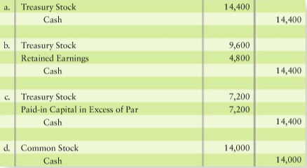 a. Treasury Stock 14,400 Cash 14,400 b. Treasury Stock Retained Earnings 9,600 4,800 Cash 14,400 c. Treasury Stock Paid-in Capital in Excess of Par 7,200 7,200 Cash 14,400 d. Common Stock 14,000 Cash 14,000