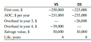 A company that manufactures amplified pressure transducers wishes to decide between the machines shownâvariable speed (VS) and dual speed (DS). Compare them on the basis of rate of return and determine which should be selected if the MARR = 15% per year