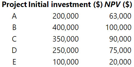 A companyâs board of directors has imposed an $800,000 limit on capital spending for the current year. Management has identified the following five projects with positive NPVs. Which projects should be chosen?