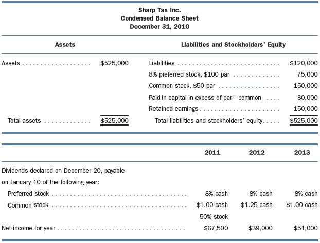 Sharp Tax Inc. Condensed Balance Sheet December 31, 2010 Assets Llabilitles and Stockholders' Equity Assets $525,000 Liabilities $120,000 8% preferred stock, $100 par 75,000 Common stock, $50 par 150,000 ... Paid-in capital in excess of par-common 30,000 Retained earnings... 150,000 Total assets $525,000 Total liabilities and Stockholders' Equity. .. $525,000 2011 2012 2013 Dividends declared on December 20, payable on January 10 of the following year: Preferred stock . 8% cash 8% cash 8% cash Common stock $1.00 cash $1.25 cash $1.00 cash 50% stock Net income for year $67,500 $39,000 $51,000
